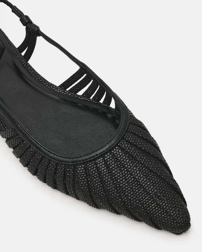 The Alandria Black Raffia is a Sophisticated Pointed-Toe Flat That Combines Timeless Elegance with Modern Comfort. Its Woven Construction Delivers Breathable Structure, While the Slingback Design Offers Secure Support. Perfect for Transitioning from Office to Evening, This Versatile Style Pairs Effortlessly with Dresses, Trousers, or Casual Wear. A Refined Essential for the Discerning Wardrobe.