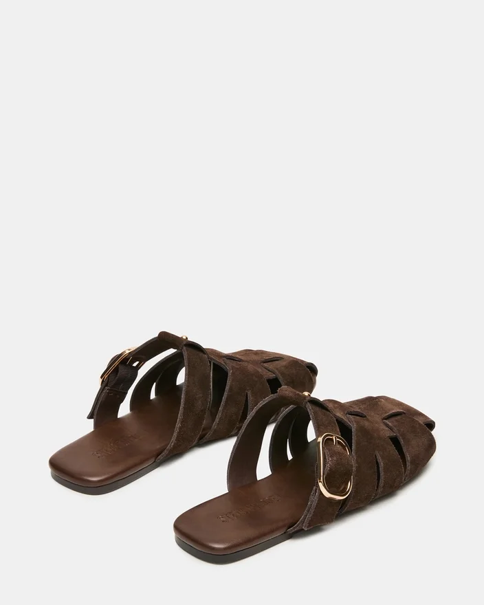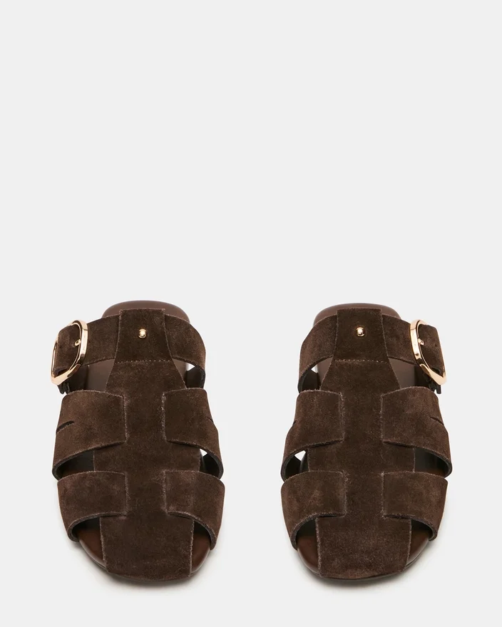 The Halo Brown Suede Features a Distinctive Fisherman Style with a Caged Design for Visual Interest and Support. The Adjustable Buckle Strap Allows for a Customized Fit, While the Flat Sole Keeps You Comfortable Throughout the Day. This Mule Silhouette Offers Easy Slip-On Convenience Without Sacrificing Style, Making It a Versatile Addition to Any Wardrobe.