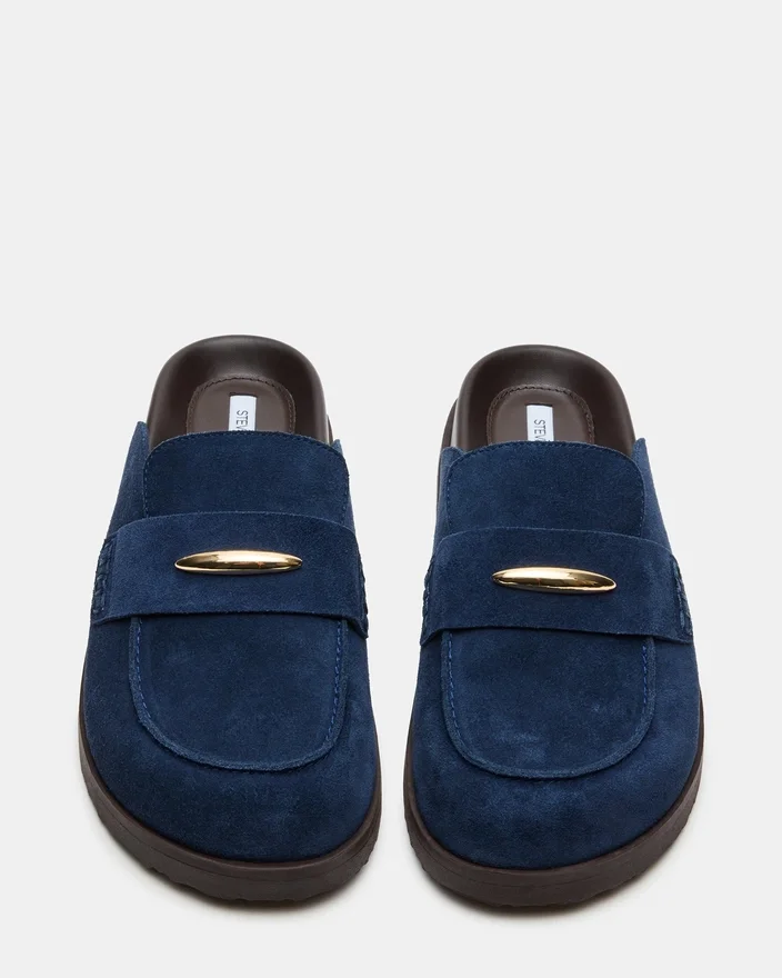 The Tobin Navy Suede Slip-On Mule Flat Offers Expert Craftsmanship with a Smooth Finish and an Easy-To-Wear Design. Its Versatile Silhouette Ensures Comfort Without Sacrificing Style, Making It Ideal for Both Casual and Professional Settings. The Flat Sole Provides Steady Support, Perfect for All-Day Wear.
