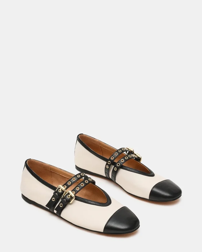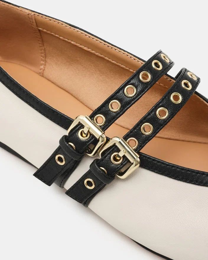 The Lydia Cap Bone Black Mary Jane Ballet Flat Combines Classic Elegance with Modern Detailing. Crafted from Quality Materials, It Features a Secure Buckle Strap That Ensures a Comfortable Fit While Adding a Refined Touch. Its Sleek Silhouette and Durable Sole Make It Ideal for Both Professional Settings and Casual Wear, Offering Versatility Without Compromising on Style or Support.