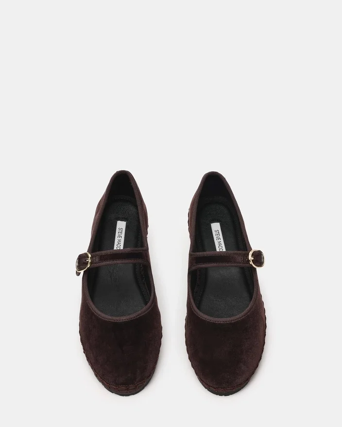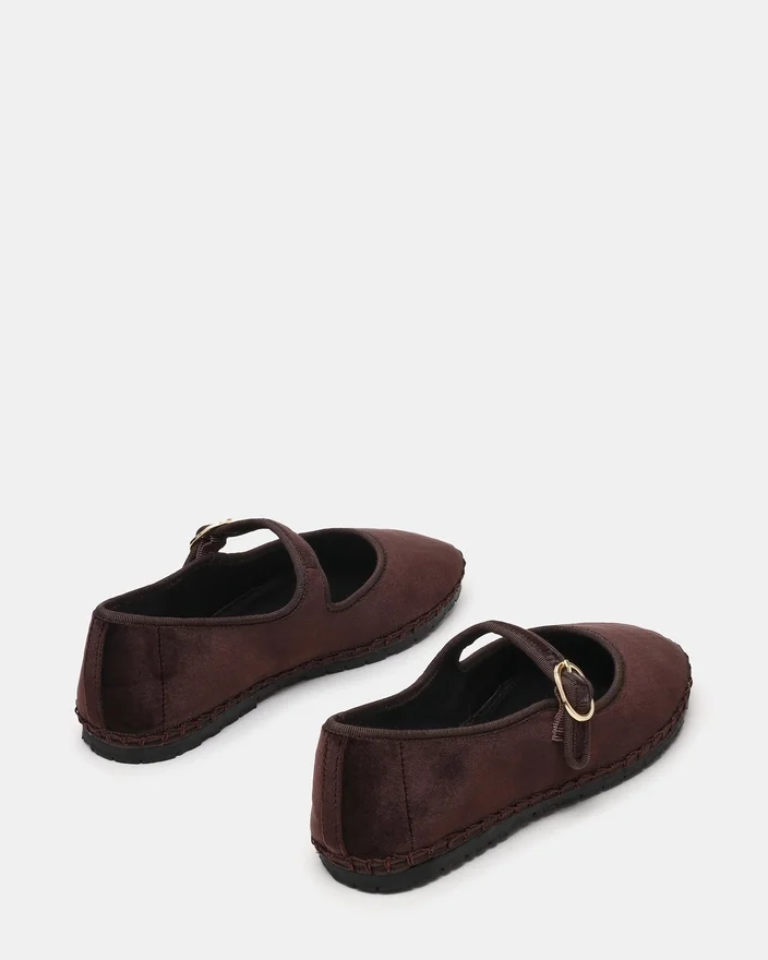 The Velma Brown Velvet Features Timeless Mary Jane Silhouette Elevated with a Secure Buckle Closure. This Flat Delivers Refined Comfort for All-Day Wear, Featuring a Rounded Toe and Classic Strap Design That Pairs Effortlessly with Any Wardrobe. The Buckle Detail Adds a Touch of Sophistication While Ensuring a Customizable Fit. Perfect for Those Seeking a Versatile, Polished Shoe.