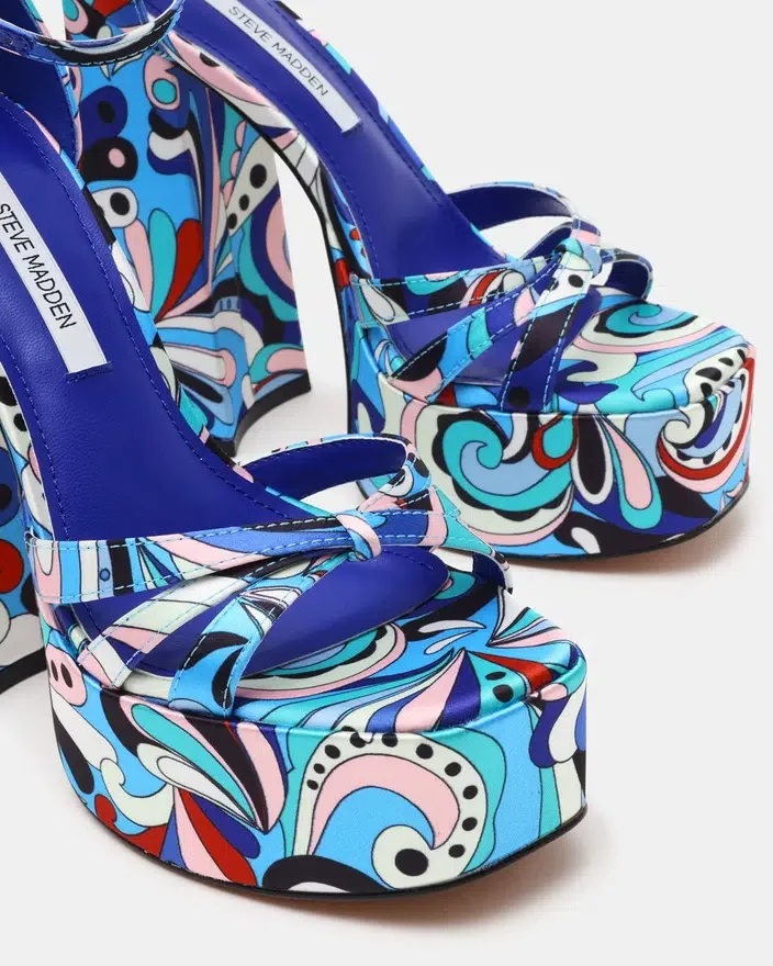 The Retro Blue Print Showcases a Classic Platform Design Paired with a Block Heel for Enhanced Balance and Comfort. Its Open Toe Offers Breathability and Style, While the Adjustable Ankle Strap Ensures a Secure Fit. This Combination Delivers Both Elevated Height and Lasting Support, Making It the Perfect Heel for Those Seeking a Refined Look.