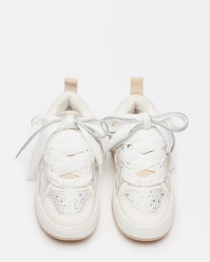 Layered Texture Gives the Roaring White Rhinestones Platform Sneakers Their Signature Look, with a Wider Set of Laces Crossed over the First Set Using Cutout Panels Along the Sides of the Shoe. Rhinestone Embellishment Finishes the Design with a Touch of Sparkle.