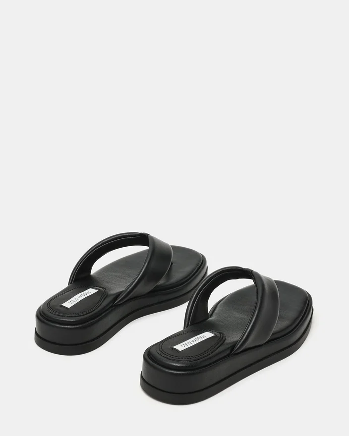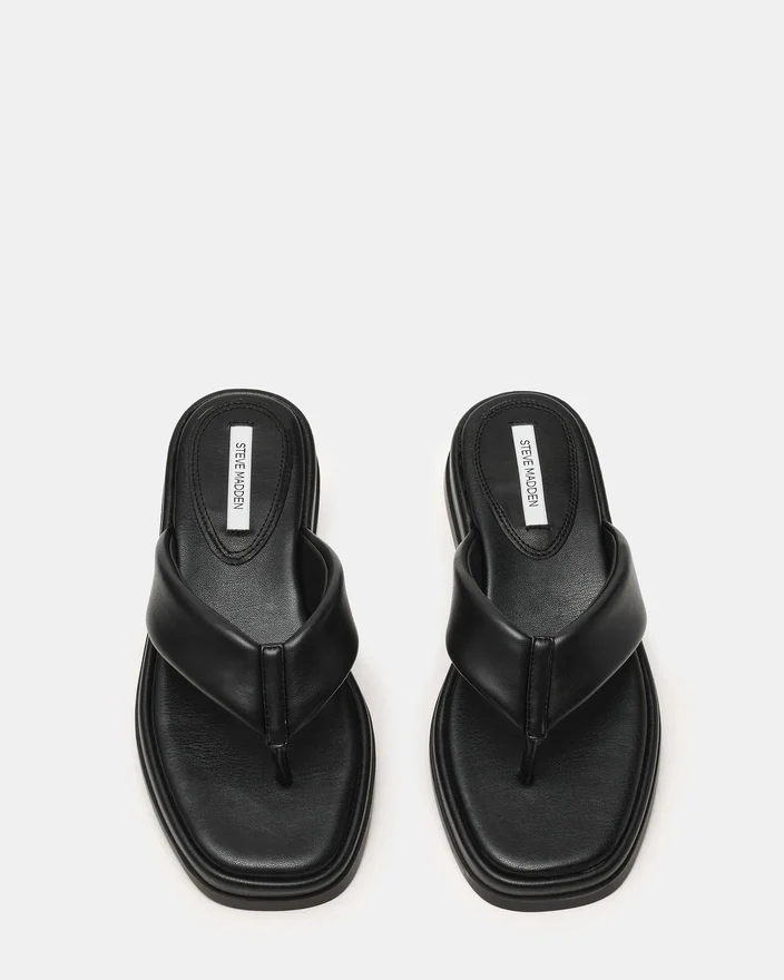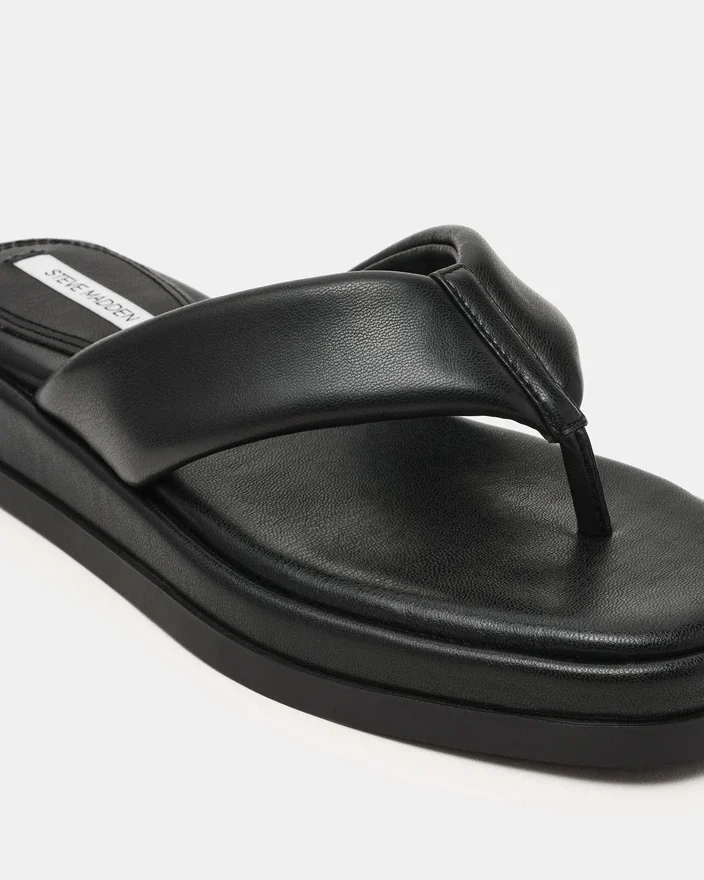 The Bella Black Platform Thong Sandal Showcases Refined Minimalism Through Its Striking Square-Toe Silhouette and Platform Sole. This Style Elevates the Classic Thong Construction with Contemporary Proportions, Creating a Shoe That Commands Attention Without Sacrificing Wearability.