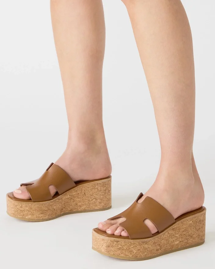 The Harmony Cognac Leather Wedge Sandal Features a Cork Platform That Delivers Both Style and Comfort for All-Day Wear. The Structured Wedge Heel Provides Stable Support Without Sacrificing Elegance. A Versatile Choice for Transitioning from Casual Outings to Elevated Occasions.