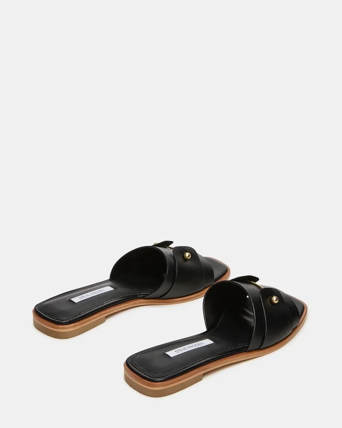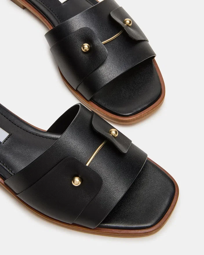 The Hasten Black Leather Sandal Delivers Effortless Sophistication with a Streamlined Slide Silhouette Crafted from Premium Materials. Delicate Gold Detailing Elevates the Minimalist Design, Adding a Refined Touch That Transitions Seamlessly from Casual to Elevated Occasions.