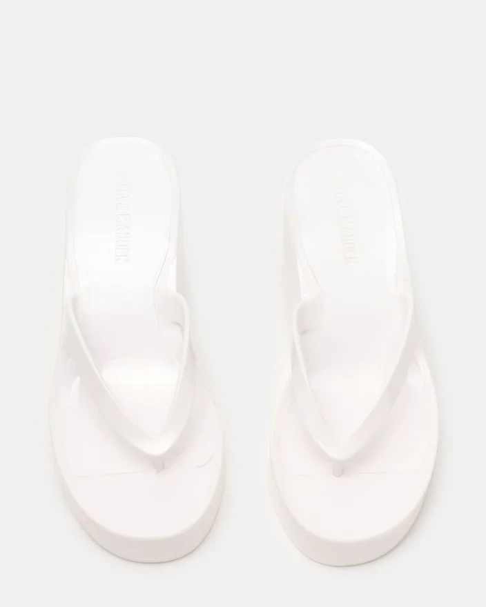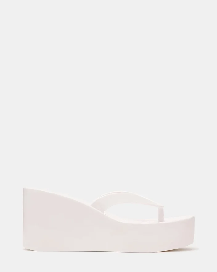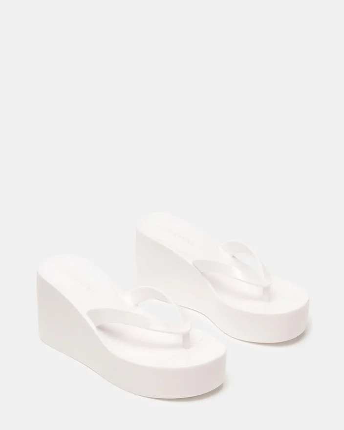 The Jella White Combines Architectural Design with Everyday Wearability. This Thong Sandal Features a Platform Base That Elevates Your Stride While the Subtle Wedge Heel Provides Support. The Structured Silhouette Offers Stability Without Sacrificing Style, Making It an Ideal Choice for Those Seeking Both Comfort and Sophistication in Their Footwear Collection.