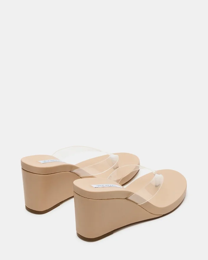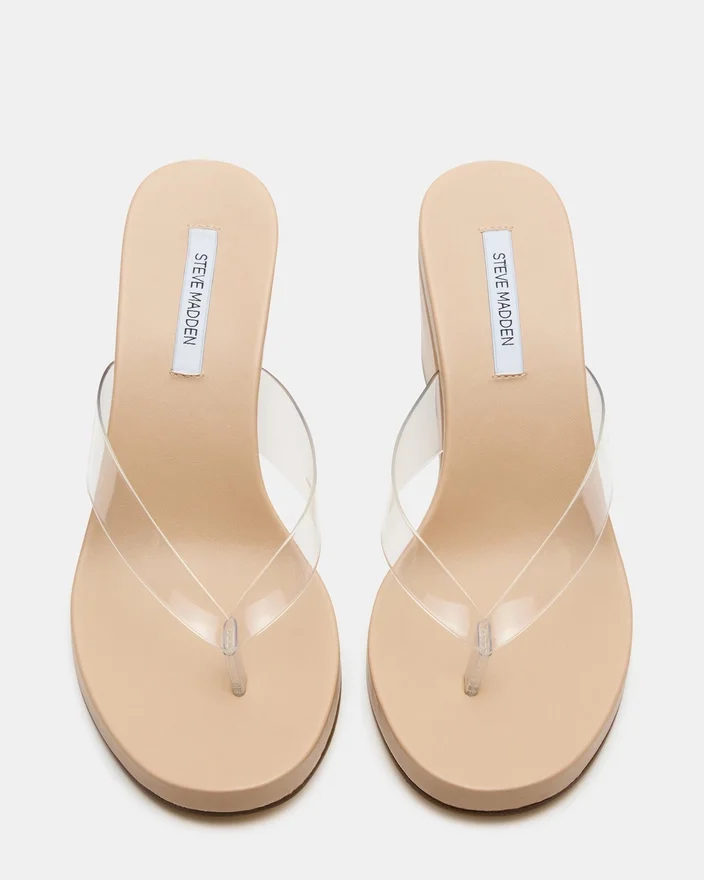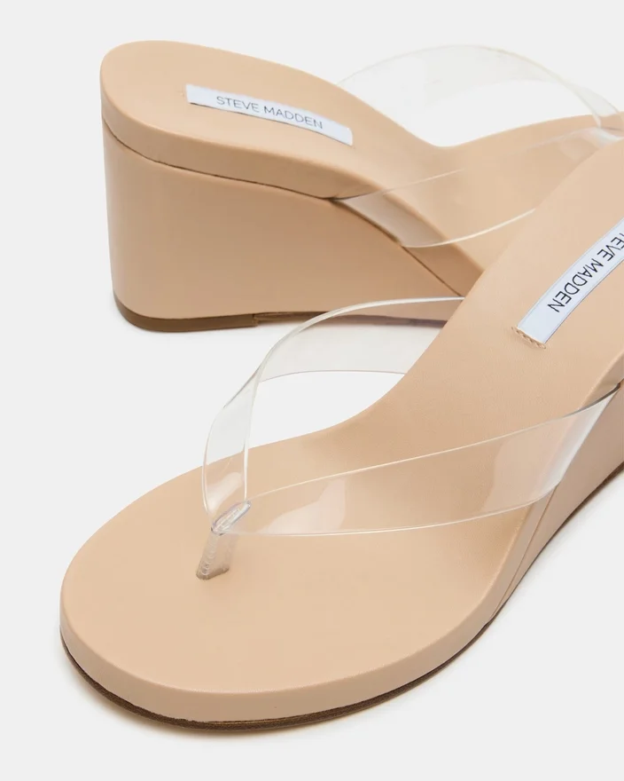 Elevate Your Summer Wardrobe with the Playing Clear Wedge Sandal. Featuring a Sleek Thong Design and a Comfortable Rounded Toe, This Mule-Style Sandal Offers Both Style and Ease. The Wedge Provides Subtle Lift and Stability, Making It Perfect for All-Day Wear. This Sandal Combines Sophistication with Versatility for Effortless Pairing with Casual or Dressy Outfits.
