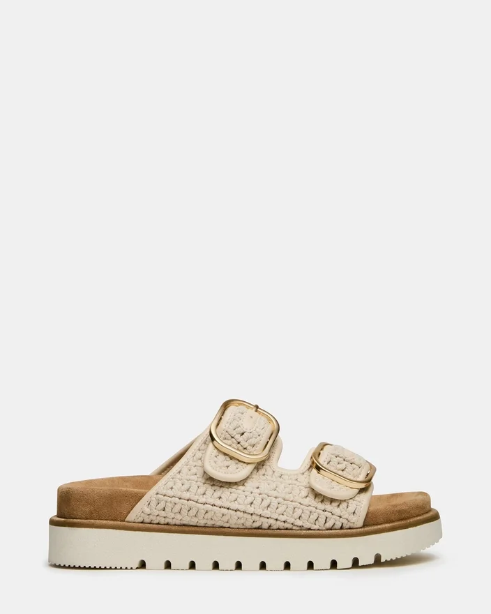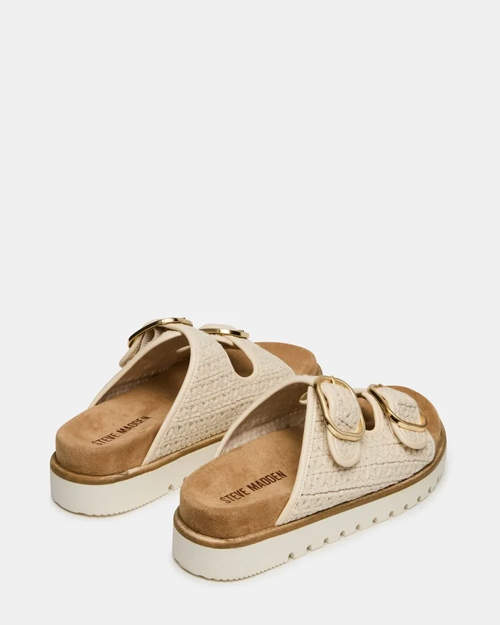 The Shellby Cream is an Expertly Crafted Woven Sandal Designed for Effortless Comfort and Style. The Slide Silhouette Features Secure Buckle Closures That Provide Adjustable Fit and Stability Throughout the Day. A Contoured Footbed Offers Arch Support and Cushioning, Making This Versatile Piece Ideal for Both Casual Outings and Relaxed Occasions. The Woven Construction Delivers Breathable Wear Perfect for Warm Weather.