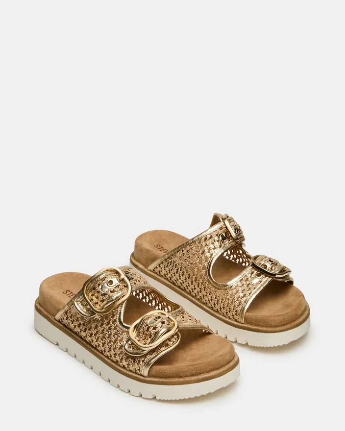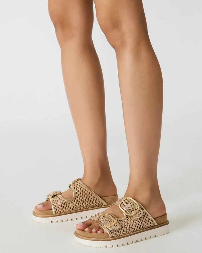 The Shellby Gold is an Expertly Crafted Woven Sandal Designed for Effortless Comfort and Style. The Slide Silhouette Features Secure Buckle Closures That Provide Adjustable Fit and Stability Throughout the Day. A Contoured Footbed Offers Arch Support and Cushioning, Making This Versatile Piece Ideal for Both Casual Outings and Relaxed Occasions. The Woven Construction Delivers Breathable Wear Perfect for Warm Weather.