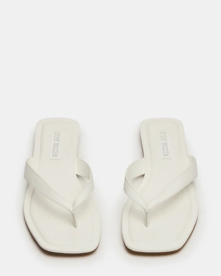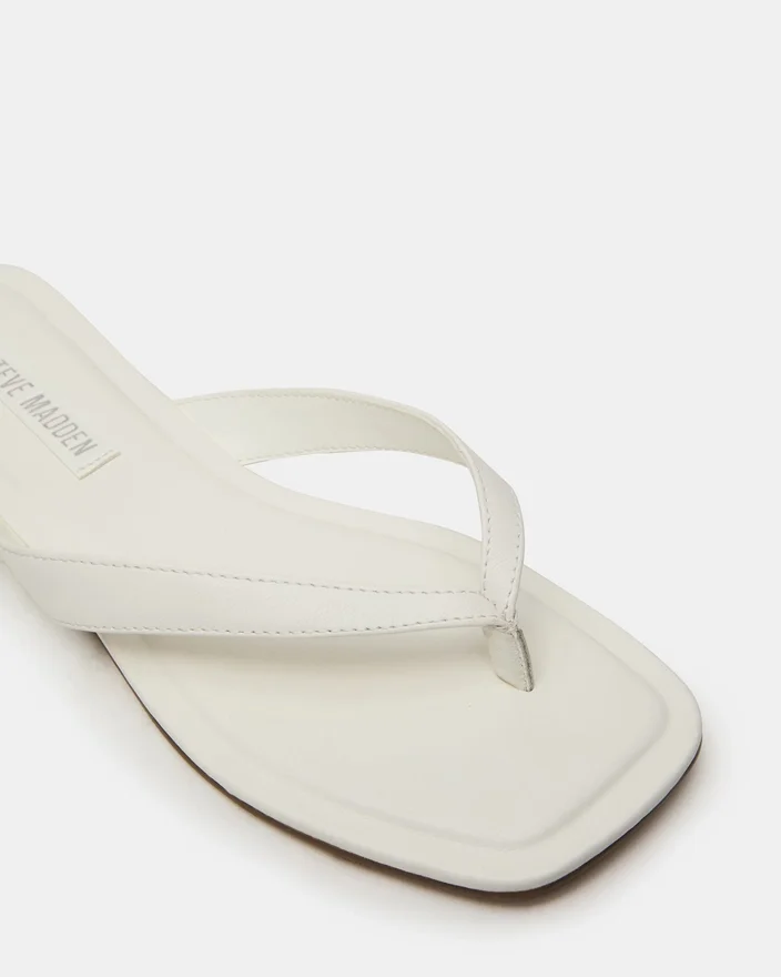 The Trella White Leather Sandal Features a Modern Square-Toe Design Combined with a Minimalist Thong Strap, Offering Both Style and Comfort. Crafted from Quality Materials, It Provides a Refined Look Suitable for Various Occasions. Its Sleek Silhouette Enhances Foot Shape While Ensuring a Secure Fit, Making It an Expert Choice for Those Seeking Understated Elegance in Warm-Weather Footwear.