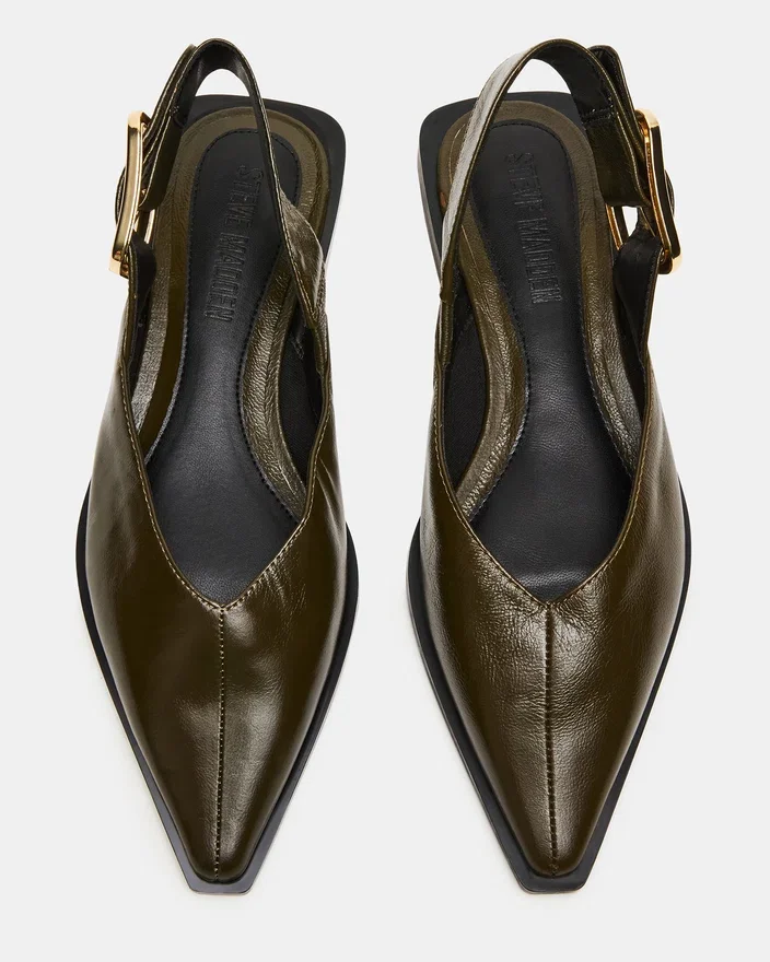 The Shay Olive Leather is a Pointed-Toe Slingback Ballet Flat That Combines Refined Style with Comfort. Crafted from Quality Materials, It Offers a Sleek Silhouette Perfect for Both Professional and Casual Settings. The Slingback Design Ensures a Secure Fit While Maintaining Breathability, Making It an Ideal Choice for All-Day Wear. This Flat Balances Elegance and Practicality, Enhancing Your Wardrobe with a Versatile, Expert-Approved Footwear Option.