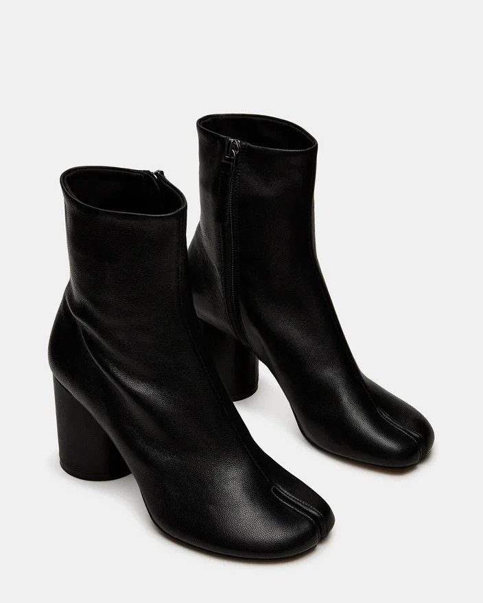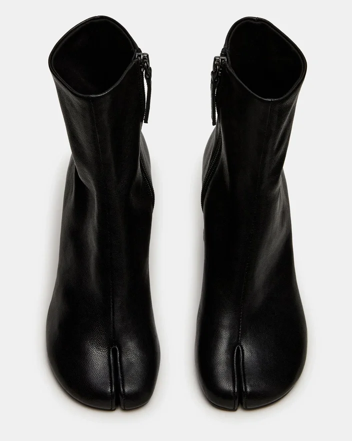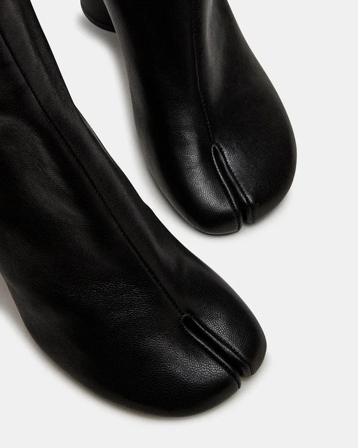 The Caro Black Leather Features the Distinctive Tabi Split-Toe Silhouette, Offering a Modern Aesthetic with Functional Comfort. A Sturdy Block Heel Provides Stable Support Throughout the Day While Maintaining a Sleek Profile. This Bootie Seamlessly Combines Elevated Style with Everyday Versatility.