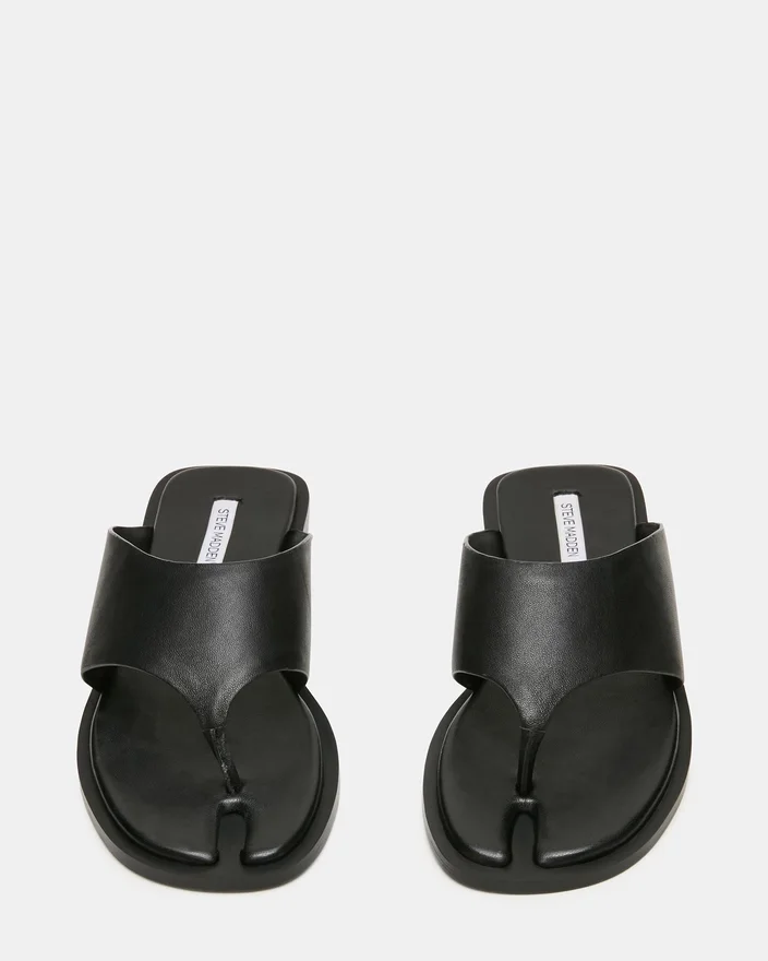 The Illia Black Leather Reimagines the Classic Tabi Sandal with a Contemporary Twist. Featuring a Thick, Architectural Strap That Delivers Both Support and Style, This Thong Sandal Channels Minimalist Design with Maximum Impact. The Distinctive Silhouette Offers a Modern Edge While Maintaining Everyday Wearability, Making It an Ideal Choice for Those Who Appreciate Bold, Statement-Making Footwear.