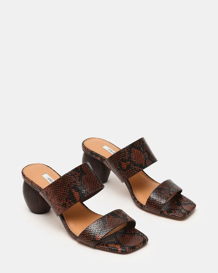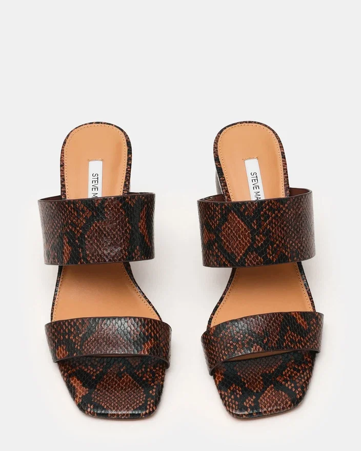 Step into Effortless Style with the Nola Brown Snake. This Modern Mule Features a Distinctive Square Toe and Sturdy Block Heel for All-Day Comfort and Stability. Thick, Supportive Straps Keep Your Foot Secure While Delivering a Bold, Contemporary Look. Perfect for Transitioning from Day to Night with Minimal Effort.