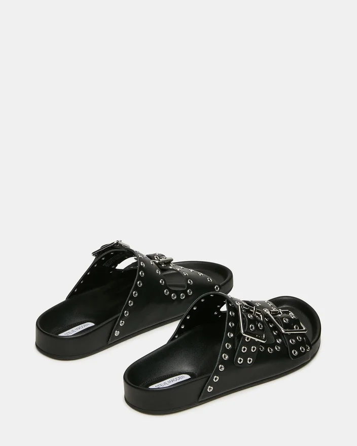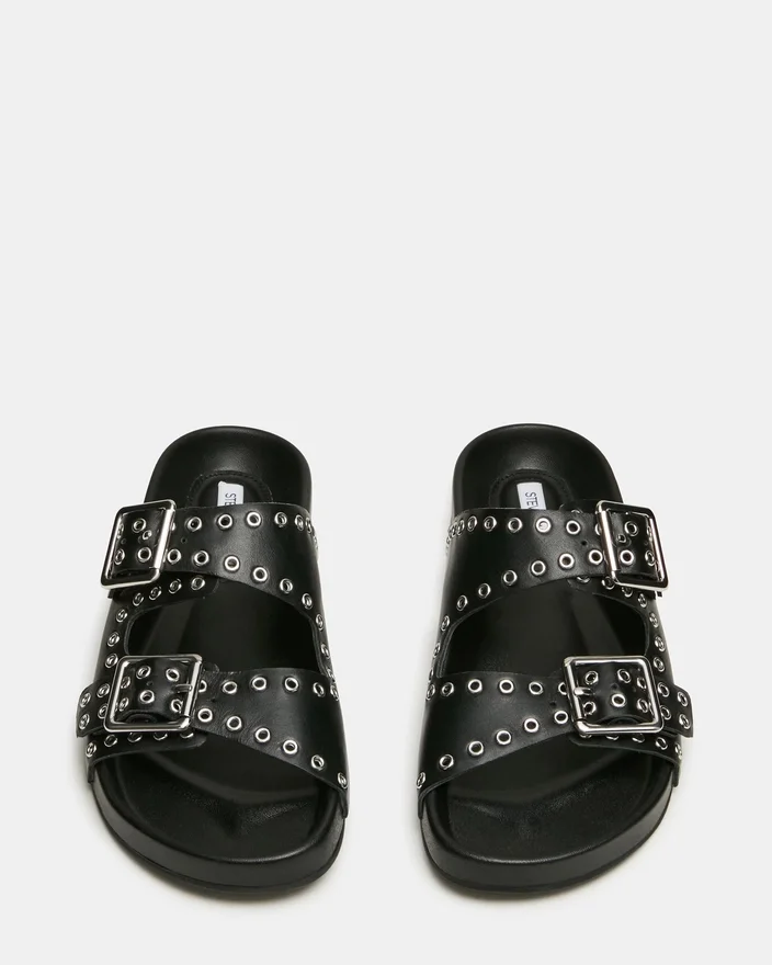 The Abott Black Leather Slide Sandal Combines Understated Elegance with Practical Comfort. Intricate Grommet Detailing Adorns the Upper, While Dual Buckles Ensure a Customizable, Secure Fit. The Supportive Footbed is Engineered for Extended Wear, Making This a Sophisticated Choice for Those Who Demand Both Style and Functionality in Their Everyday Footwear.