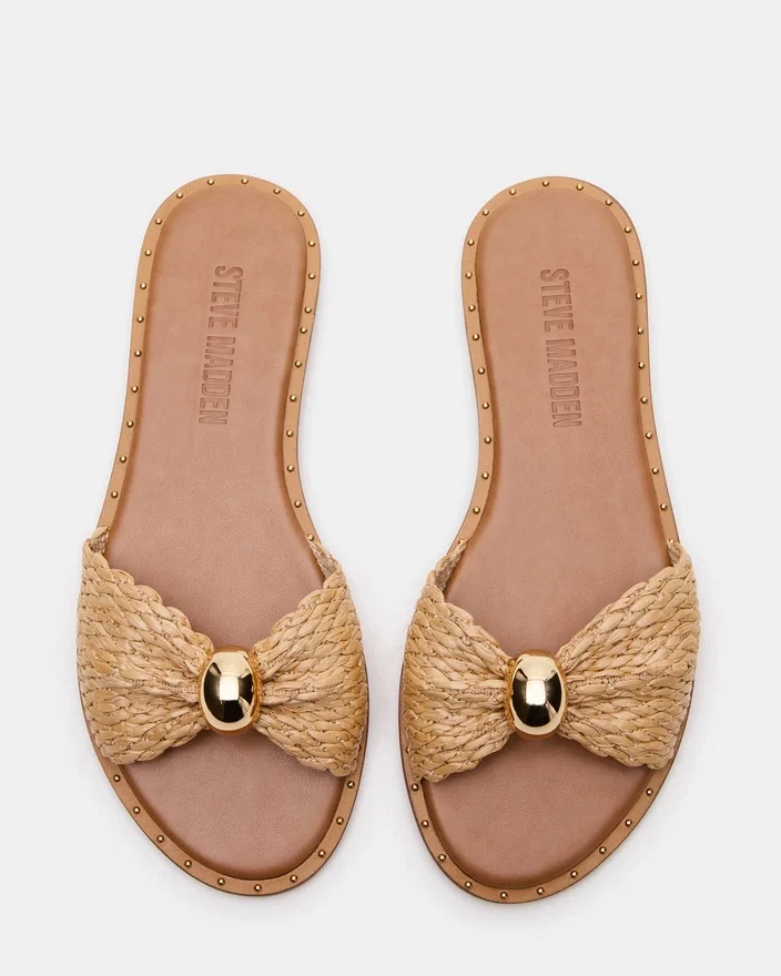 This Dipsy Slide Sandal Features Mini Studs and a Rounded Toe for Added Style and Comfort. The Perfect Combination of Fashion and Practicality, These Sandals Are a Must-Have for Any Wardrobe. With Their Natural Raffia Design, They Add a Touch of Rustic Charm to Any Outfit.