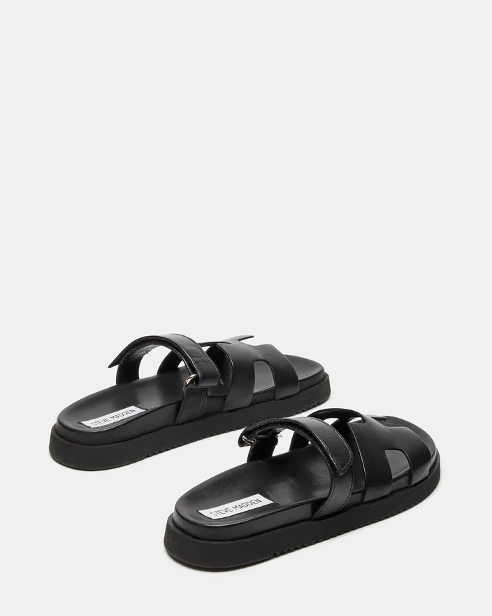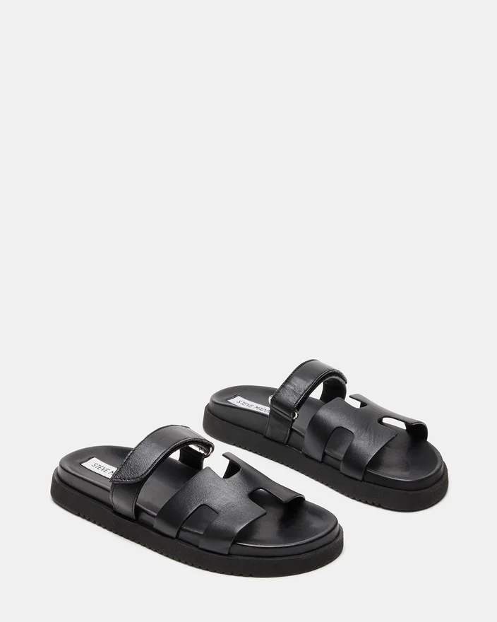 The Leather Mayven Slides Feature Comfy Construction Details Like a Molded Footbed, a Treaded Flatform Sole, and an Adjustable Top Strap, Plus a Front Strap with a Geometric Cutout Design.