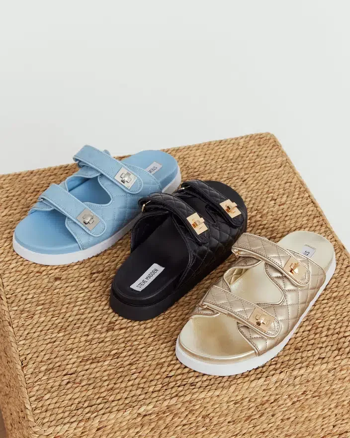Indulge in Luxury with the Schmona Slide Sandal. The Quilted Material Gives a Touch of Opulence, While the Turn-Lock Clasps Add a Sophisticated Detail. The Double Strap Design Provides Comfort and Elegance in One. Elevate Your Style with This Exclusive and Tasteful Choice.